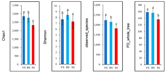 Alpha diversity indices of rumen bacteria in yak cows in different phenological periods. a–c Mean values with different superscripts are different at p < 0.05 according to Duncan’s multiple-range test. VS: Vegetative stage, BS: Bloom stage, SS: Senescent stage.