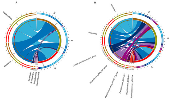 Bacterial phyla (A) and genus (B) (relative abundance >0.1% in at least 60% of the yaks within each phenological period) of 3 the phenological periods visualized using Circos. VS: Vegetative stage, BS: Bloom stage, SS: Senescent stage.