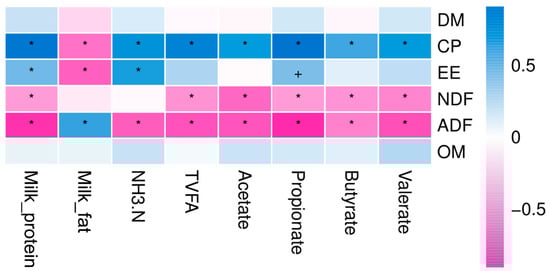 Spearman correlation and clustering analysis between milk composition, ruminal fermentation parameters, and nutrient composition of herbage. The depth of the color indicates the correlation between species and environmental factors. DM: dry matter, CP: crude protein, EE: ether extract, OM: organic matter, NDF: neutral detergent fiber, ADF: acid detergent fiber, TVFA: Total volatile fatty acids, NH3-N: ammonia nitrogen. The “+” and “*” indicates the different level at 0.05 and 0.01, respectively.