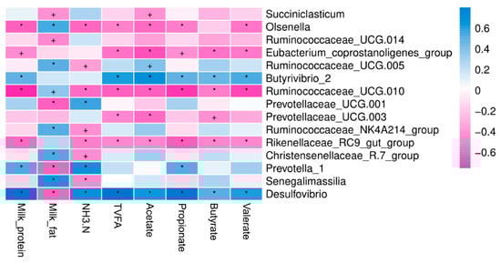 Spearman correlation and clustering analysis between milk composition, ruminal fermentation parameters, and main bacteria at genus level. The depth of the color indicates the correlation between species and environmental factors. TVFA: Total volatile fatty acids, NH3-N: ammonia nitrogen. The “+” and “*” indicates the different level at 0.05 and 0.01, respectively.