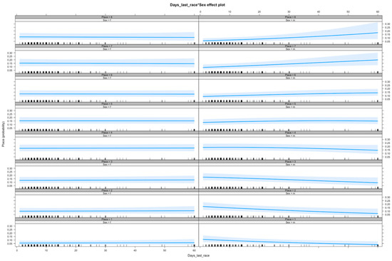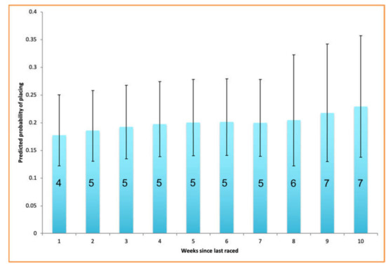 Male greyhounds in the current study were significantly more likely to place favourably than females. However, this was complicated by an interaction between sex and days since last raced. Whereas females showed no clear pattern in their performance regardless of how long it had been since they were last raced, males were more likely to place poorly the longer it had been since they last raced. There was no significant difference between males and females in latency since the previous race. The effect of this interaction on performance is intriguing but small and difficult to interpret. There was a significant negative correlation between mean eye temperatures before the races and latency since the previous race. This is at odds with a potential explanation of a more intense stress response to the race meet environment after longer rest periods. It is possible that increasing latency since the previous race compromises musculoskeletal strength and race fitness, as extant data on racehorses show an increase in the likelihood of sustaining a serious injury during a race with increasing days since last racing [