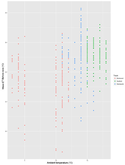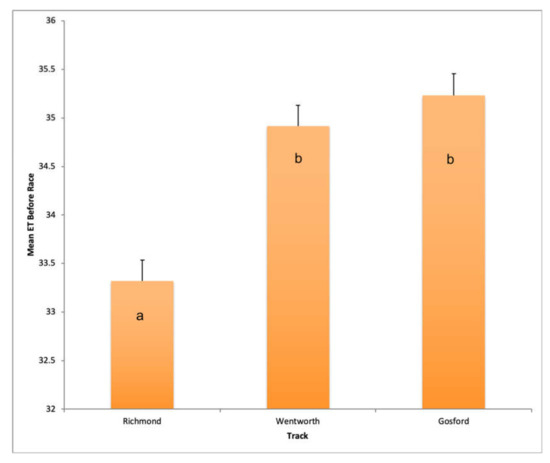 There was a significant difference among mean eye temperatures, both before and after races, at different tracks. This between-track difference was strongest among eye temperature before races, which is the metric most directly reflective of stressors arising in the general racetrack environment. A general linear model, with mean eye temperatures before races as the independent variable, revealed a significant positive influence of both Wentworth Park and Gosford compared to Richmond, with Richmond being associated with the lowest mean eye temperatures before the race. This may have been influenced by ambient temperature, but the effect of ambient temperature was neither strong nor significant. This finding suggests that some attributes of the Gosford racetrack may be inherently more stressful than Wentworth Park and that those of Richmond may be less stressful than those of Wentworth Park. Attributes worth considering include the design of the kennel facilities, as the catch pen, stir-up and kennel block are all very close to each other at Wentworth Park, but more separated at Gosford and at Richmond the kennel block is farthest of all three tracks from both the racing track (see