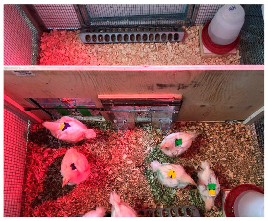 At 9 and 10 days old, the chicks were habituated to the substrates: fresh pine and spruce wood shavings (FP), fresh aspen wood shavings (FA), soiled pine and spruce wood shavings taken from other broiler chick pens (SP), and soiled pine and spruce wood shavings treated with an ammonia reductant (37 kg/100 m2 of PLT®—Poultry Litter Treatment, Jones-Hamilton Co., OH, USA) (TSP). The soiled substrates (SP and TSP) were soiled shavings obtained from other broilers (2 weeks of age) kept under standard conditions at the research facility. The SP litter functioned as a negative control. All four litters were placed in the corners of chicks’ pens to habituate the chicks and during this time the litters could be freely explored for 24 h.