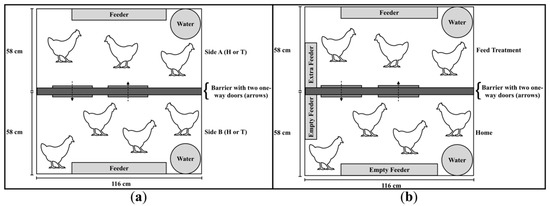 Experimental setup of broiler chick floor pens. Each pen contained two compartments (H and T) separated by a barrier with two unidirectional push doors that could be loaded to 10%, 20%, or 30% of the pen’s median chick body weight. T and H alternated between Side B or Side A to avoid side bias. (a) Pen setup when testing substrates (soiled pine and spruce shavings, soiled pine and spruce shavings treated with an ammonia reductant, fresh pine and spruce shavings, and fresh aspen shavings). (b) Pen setup when testing feed treatment.