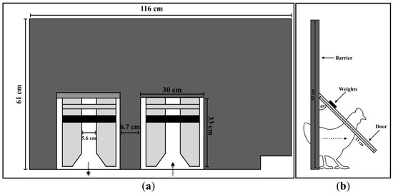 (a) Barrier layout with push doors viewed from chicks’ eye level. Each barrier contained two one-way push doors. Weights are shown as black bars that mount just above where the chicks’ heads would be when pushing the door. (b) The door rests on the chick’s shoulders as she pushes through the door. The maximum amount of weight the chick would feel would be when the door is at a 45° angle.