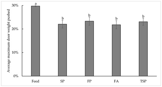 The average maximum weight pushed (0%, 10%, 20%, or 30% of chicks’ median pen body weight) to access resources in the treatment compartment (feed, soiled pine and spruce wood shavings (SP), fresh pine and spruce wood shavings (FP), fresh aspen wood shavings (FA), ammonia reductant treated soiled pine and spruce wood shavings (TSP)). Bars with different letters display significant differences (p < 0.05).