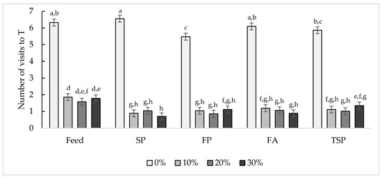 Data were analyzed using SAS Studio (SAS Inst. Inc., Cary, NC, USA). Each chick’s time spent in T was calculated based on the number of time-points an individual was present in T out of a total observed time-points, while the number of visits to T was determined by counting the number of entrances to T. Maximum price paid was calculated as the mean maximum door weight pushed by all birds to access a resource. The percentage of time chicks spent in T, number of entrances to T, and maximum price paid to enter T were analyzed with a Gaussian distribution, and results are shown as LS means ± SE. The models were evaluated to ensure they met the assumptions of normally distributed residuals and homogeneity of variance, which were graphically inspected using QQ plots. Generalized linear mixed models (GLIMMIX) assessed the effect of treatment (feed, FP, FA, SP, TSP), door weight (0%, 10%, 20%, and 30%), and their interaction on time spent in T, number of entrances to T, and maximum price paid. Statistical significance was considered at p < 0.05 and tendencies are reported at 0.05 ≤ p ≤ 0.1.