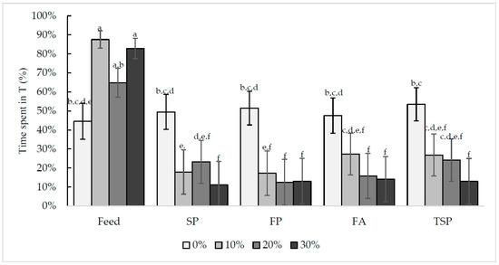 Effect of door weight (0%, 10%, 20%, or 30% of chicks’ body weight) and resource (feed, soiled pine and spruce wood shavings (SP), fresh pine and spruce wood shavings (FP), fresh aspen wood shavings (FA), ammonia reductant treated soiled pine and spruce wood shavings (TSP)) on the mean time spent (%) in the treatment (T) compartment for 13.5 h per day. Bars with different letters display significant differences (p < 0.05).