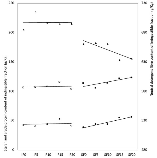 | Indigestible fraction (g/kg) | 560.8 | −4.05 ± 2.68 | −319.5 ± 6.1 *** | 0.86 ± 0.02 *** | 1.43 ± 0.27 *** | 0.29 ± 0.27 |