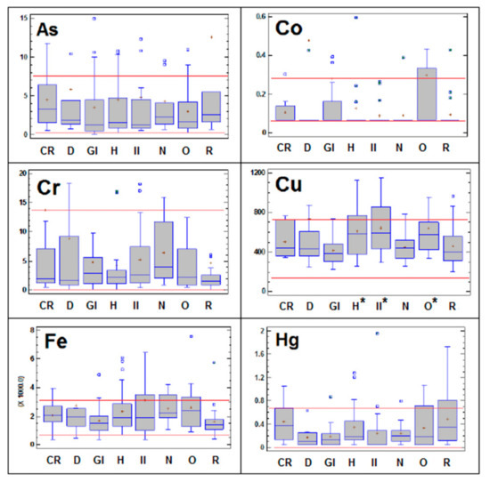 4.2. Essential Trace and Toxic Element Concentrations in Dogs Suffering from Different Pathologies