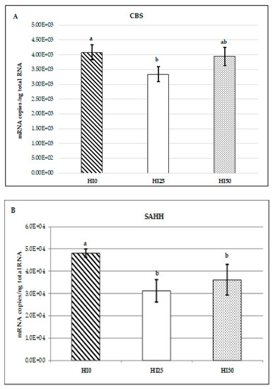 With regard to the mRNA levels of the SAHH enzyme, we found much higher copies in the liver of the HI0 fish group than in the other two groups fed lower levels of Met. In the HI0 group, the increased expression of the SAHH gene was paralleled by the higher hepatic SAH level with respect to the HI25 and HI50 groups. This result is once again in agreement with the outcomes of Kwasek et al. [22], who showed an increase in SAHH gene expression in fish fed a Met-supplemented diet and, as a consequence, an accumulation of SAH due to dietary Met intake.