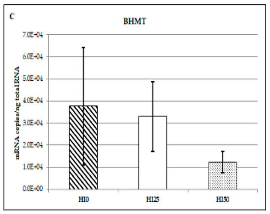 The CBS mRNA copy number was significantly lower (p < 0.05) in the liver of trout fed the HI25 diet than in fish fed the control (HI0) diet, whereas the CBS transcript levels in fish fed the HI50 diet were not different from the other two fish dietary groups (Figure 1A). The SAHH gene showed the same trend as that of CBS, with the lowest number of mRNA copies recorded in the HI25 fish group (p < 0.05; Figure 1B). However, unlike CBS, the expression of the SAHH gene in the HI25 group was not statistically different from that of the HI50 group. The expression levels of the BHMT gene were not significantly different between the fish feeding groups (p > 0.05; Figure 1C).