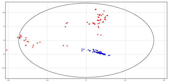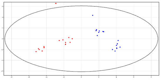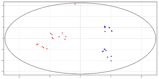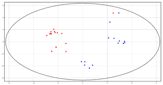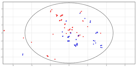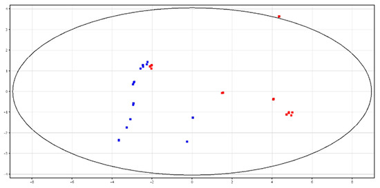 PCA scores plots of the LC–MS data acquired from cryopreserved seminal plasma for high (in red) and low (in blue) fertility bulls. PC1 (x-axis) is 50.89%; PC2 (y-axis) is 13.96%.