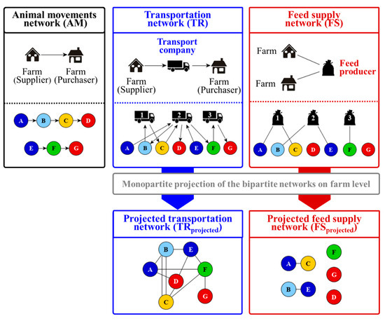 In the first instance, three network representations were constructed out of the available data basis: the monopartite animal movements network (AM), the bipartite transportation network (TR) (including only information about the farms and the transport companies) and the bipartite feed supply network (FS) (including only information about the connections between farms and feed producers). The monopartite animal movements network includes the direct trading activities between the farms, which implies that there is only one node set present in the network. In contrast to this, both bipartite network representations allow the inclusion of also indirect transmission routes into the network analysis including two node sets. For the transportation network, the farms are indirectly connected with each other over the transport company organizing the transport of the animals from the supplier to the purchaser. In the feed supply network, the farms are indirectly connected with each other over the feed producer delivering feed to each farm.
