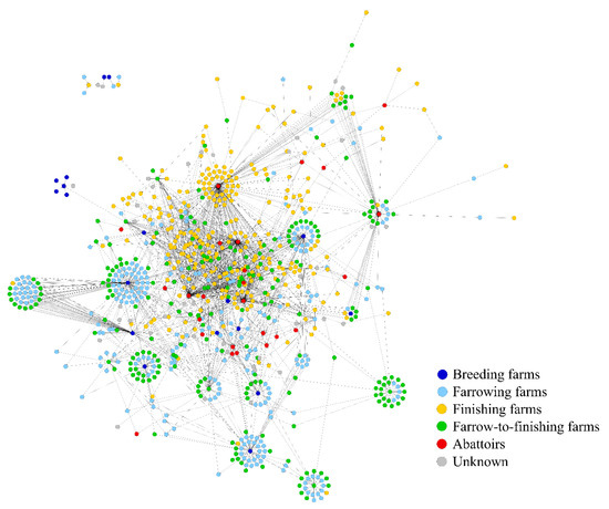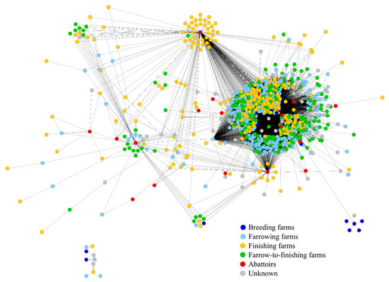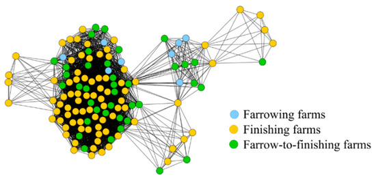 The projected feed supply network has the same configuration of number of farms, farm types, and isolated farms compared to the bipartite feed supply network. The 866 farms were connected by 3284 edges. Figure 4 illustrates the projected feed supply network. The figure was drawn without isolated nodes to enhance the clarity of the graphical illustration.