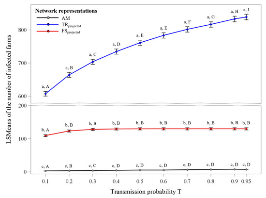 The results of the statistical model showed that all fixed effects, as well as the interaction between network representation and transmission probability, were significant (p ≤ 0.05). Figure 5 illustrates the LSMeans ± standard error of the number of infected farms for the interaction between network representation and transmission probability. It could clearly be seen that within each transmission probability, the differences between each network representation were significant (p ≤ 0.05). The projected transportation network revealed the highest number of infected farms ranging from 607 to 839, followed by the projected feed supply network with LSMeans ranging from 109 to 130 infected farms. The lowest LSMeans were detected for the animal movements network with values ranging from three to eight infected farms.