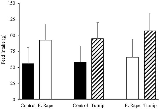 Pigs’ feed intake (g) of corn–soybean base diets (least squares means + standard error) with the inclusion of 15% of forage rape, turnip, or wheat middlings (control) when animals were offered a two-feeder preference test during 10 min.