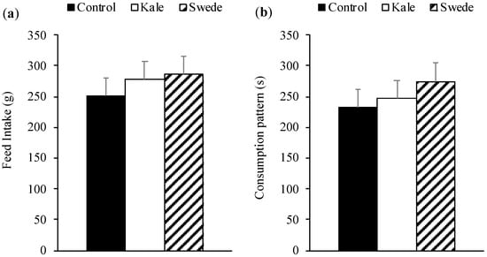 Results of the two-choice preference test are shown in Figure 4. No differences were observed between the consumption of control vs. kale (p = 0.491), nevertheless the diet that incorporated swede presented a higher consumption than control (p = 0.003) and kale (p = 0.004).