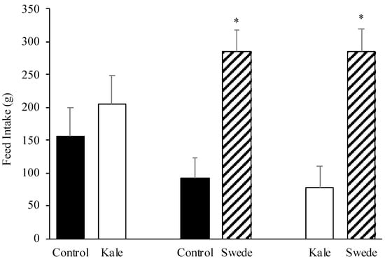 Least squares means (+ standard error) of pigs’ feed intake (g) of corn–soybean base diets with the inclusion of 15% of kale, swede, or wheat middlings (control diet) when animals were offered a two-feeder preference test during 10 min. * p < 0.05.