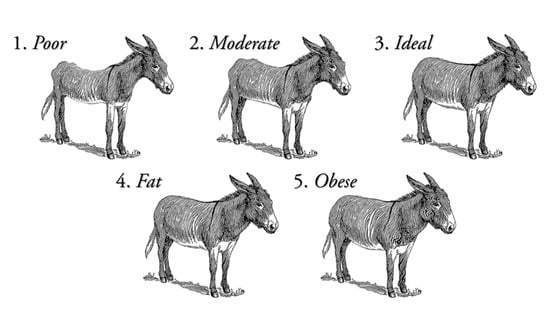 - Valle, E.; Raspa, F.; Giribaldi, M.; Barbero, R.; Bergagna, S.; Antoniazzi, S.; Mc Lean, A.K.; Minero, M.; Cavallarin, L. A functional approach to the body condition assessment of lactating donkeys as a tool for welfare evaluation. PeerJ 2017, 5, e3001. [Google Scholar] [CrossRef]