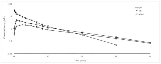 Semi-logarithmic plasma concentration–time curves of doxycycline hyclate following intravenous (IV), intramuscular (IM) and oral administrations at a dose of 20 mg/kg in goats (n = 6, mean ± SD).