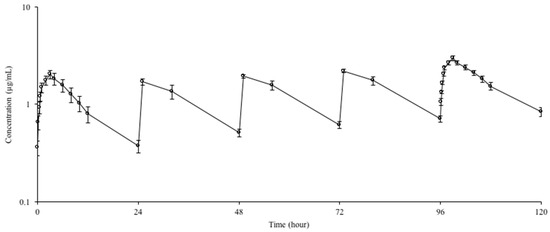 Semi-logarithmic plasma concentration–time curves of doxycycline hyclate following repeated oral administrations at the dose of 20 mg/kg every 24 h for 5 days in goats (n = 6, mean ± SD).