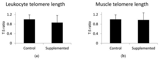 (a) Leukocyte and (b) gluteus medius muscle telomere length determined using Cawthon’s method. T:S is the ratio of telomere repeat copy number to a single gene copy number. Values are the mean +/− standard deviation. Statistical differences were analyzed by unpaired t-test.
