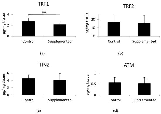 Levels of (a) telomere repeat factor- 1 (TRF1), (b) telomere repeat factor-2 (TRF2), (c) TRF1-interacting protein 2 (TIN2), and (d) ATM kinase in muscle samples, determined using ELISA tests. Values are the mean +/− standard deviation. Statistical differences were analyzed using the unpaired t-test. Differences of p < 0.05 were considered statistically significant, ** p < 0.01.
