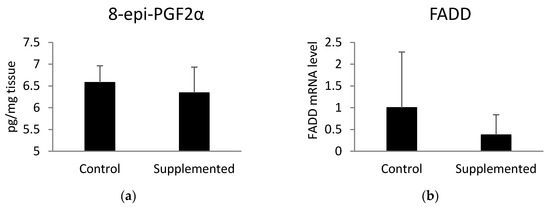 (a) Concentration of muscle 8-epi-prostaglandin F2α (8-epi-PGF2α) measured using ELISA test and (b) the mRNA level of Fas-associated via death domain (FADD) determined by quantitative real-time PCR. Statistical differences were analyzed using unpaired t-tests.