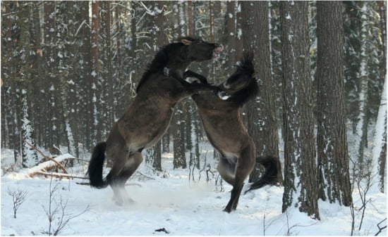 The social behavior of the Koniks did not differ from other free-roaming horses [33]. However, no tendency for grouping into big herds [23] was observed, with one exceptional case of two stallions (out of 21 that were able to keep their harems; data for 1959–2020) that usually roamed together with their harems. The sole but important difference was the annual reduction in the population by removing the weanlings. Hence, the composition of bands was skewed for higher female representation, and no bachelor groups were ever formed in Popielno sanctuary, as observed in other feral herds [23,59]. This policy had an impact on the social behavior of horses, as from the very beginning, the stallions could easily form and maintain harems, and unlike in multistallion populations [23], no harassment from young stallions ever took place [60,61]. Despite this comfortable situation, fights between harem stallions occurred during and outside the reproductive season [59]. The take-over of harems due to fights usually resulted in the quick death of the defeated stallion as a result of the exhaustion caused by the constant alertness, decreased feeding time, and harassment, and most probably, the on-going health problems which could have been the primary cause of the gradual loss of stallion’s power to guard the mares and succeed in fights [59]. Although confrontations between stallions in their prime mostly consisted of impressive parades [60] and resulted in rather superficial injuries, they were sometimes very serious (Figure 1). A case of a potentially fatal fight resulting in a mouth injury (a piece of lip was bitten off, preventing the animal from feeding) was recorded. This is another example of how the welfare of free-roaming horses may be impaired.