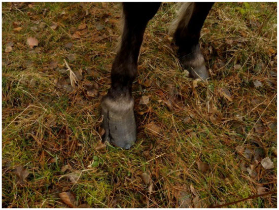Since Koniks are isolated from other conspecifics, no infectious illness was diagnosed in this population. Most health problems were related to hoof wear and parasite invasions. The Koniks in the sanctuary were not trimmed and their hooves were subjected to the natural processes of growing and shaping during wearing, which relate to season, distance traveled, and ground specifics [34,74,75,76,77,78,79]. Within sanctuary borders, Koniks usually travelled on grassy or sandy ground, and analyses showed that hooves were not worn off as a whole [78]. Actually, the horny part of the hoof is torn and distorted as it becomes overgrown [77,78]. Before the horn detaches from the hoof wall, the wall cracks about 1–3 cm [77,78]. No deformation of the hooves or leg posture was noticed in Koniks. It was observed that after 1–3 months, the hoof looked normal, and with this natural “self-trimming,” no lameness was ever observed during the daily visual inspections, which included an inspection of any internal abnormalities of the hoof [41,76,80]. In the last 30 years, cases of deeper cracks, up to the middle of the hoof or even up to the coronary band (Figure 3) were noted in three horses [77]. Even so, no lameness was observed in two of the horses. In the third horse, lameness lasted 2 months: the horse was not able to stand on the affected leg, but as soon as the fractured horn had broken, the horse became sound within 1 week [77]. Usually, the cracks were not deep and naturally filled in. Interestingly, it was found that the hooves of “forest” Koniks grew at a slower rate than those in a “stable” group, where the horses are regularly trimmed [77] and followed seasonal changes, similar to other feral domestic [75,78] and Przewalski (Equus ferus Przewalskii) horses [81]. Generally, periods when hooves were in a better and worse condition occurred spontaneously during the horses’ lifetime [77]. This can be explained not only by periodic (winter) drops in food quality and availability but also with more regular locomotion on varied types of ground [76,80]. Thanks to slow locomotion and no predation, lame horses can survive; nonetheless, their welfare is reduced during such critical periods. However, a lack of lameness is not evidence that the hooves are healthy, since lameness may not occur during the on-going laminitis [38,42] or self-trimming [76,80]. Frequent histopathological changes in feral horses’ hooves observed in post mortem studies indicate that the feral horse foot type cannot be used as a model for the domestic horse foot [41,80].