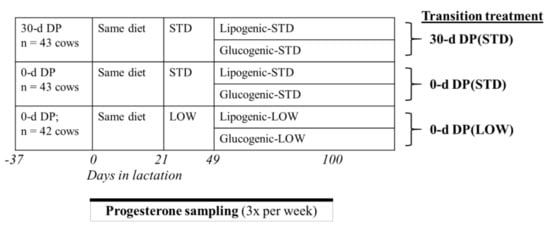 In the current study, cows with 0-d DP had more ovarian cycles within 100 DIM compared with cows with 30-d DP. In addition, cows with 0-d DP (LOW) had a lower incidence of prolonged cycles compared with cows with 0-d DP (STD) or cows with 30-d DP (STD), which can be related to shorter luteal phase length and follicular phase length. The prolonged luteal phase is one of the most common ovarian disturbances in dairy cows []. Studies reported that cows with prolonged luteal phase had a lower first AI conception rate, more services per conception, and more days open compared with cows with normal ovarian cycles [,,]. The most important risk factors for developing prolonged luteal phases are puerperal problems, such as metritis and mastitis. The ratio of prostaglandin E2 (PGE2) to prostaglandin F2α (PGF2α) decides the fate of the corpus luteum, with persistence if PGE2 dominates or luteolysis if PGF2α dominates []. Lipopolysaccharide stimulates the secretion of prostaglandins and particularly PGE2 []. Metritis and mastitis could compromise release of prostaglandin F2α (PGF2α) [,,] by increasing lipopolysaccharide in postpartum cows [], thereby delaying luteolysis, which results in a prolonged luteal phase []. In our study, however, no significant differences were found in the incidence of metritis and mastitis between the different transition treatments, the incidence of metritis in two groups were 7.1% and 4.7%, though the incidence of mastitis in transition treatment 0-d DP (LOW) was 31%, which was numerically lower than 40% in transition treatment 0-d DP (STD). A high milk yield is also one of the major risk factors for a prolonged luteal phase in high-producing dairy cows []. In addition, in the current study, the milk yield of cows with 30-d DP (STD) was greater than that of cows with 0-d DP (LOW) or 0-d DP (STD) (30.3 vs. 24.2, 24.7 kg/d) (p < 0.01).