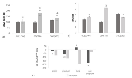 The effect of transition treatments (0-d DP (LOW), 0-d DP (STD), 30-d DP (STD) for cows of different parity classes (parity = 2 in dark grey or parity ≥ 3 in light grey) on days open (a), services per pregnancy (b); The relation of days open class (short:<80 d, medium: 80–130 d, long:>130 d and not pregnant) for cows of different parity classes (parity = 2 in dark grey or parity ≥ 3 in light grey) with energy balance (EB) in week 1 till 7 of lactation (c); a,b Values within parity class in the same row with different superscripts differ (p < 0.05).