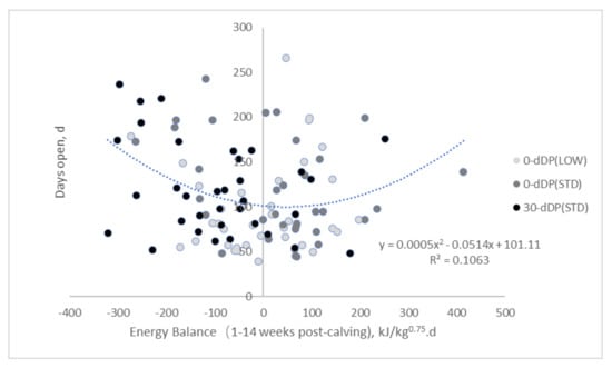 Improvement in reproductive performance related with a reduction in DP length can be associated with an improved EB and metabolic status [,,]. Concentrations of plasma glucose, IGF-I, and insulin were greater, but milk yield, plasma concentrations of non-esterified fatty acids (NEFA), and liver tri-acyl glycerides (TAG) were lower for cows after a 0-d DP than for cows after a 30-d or 60-d DP []. These endocrine and metabolic factors were associated with ovarian activity postpartum [,,]. Elevated concentrations of NEFA and β-hydroxybutyrate (BHB) in plasma reduced oocyte and blastocyst quality in vitro [,] and were associated with a later onset of luteal activity (OLA) in vivo [,]. In particular, IGF-1 and insulin are key factors for the ovarian function because they both stimulate estradiol-17β production in granulosa cells in vitro [,] and proliferation of follicular cells [,] in vitro. Contradicting, high plasma insulin concentration had negative effects on oocyte maturation in vitro [] and insulin stimulating diets are possibly beneficial to establish ovarian activity postpartum, but not to establish pregnancy []. Therefore, it can be hypothesized that for reproductive performance, with days open being the net result of resumption of ovarian cyclicity and pregnancy rates, an optimal energy balance and metabolic status would be essential rather than a maximal EB or insulin concentration.