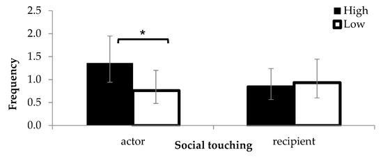 The number of social touching events observed as an actor or as a recipient (back- transformed means). Error bars indicate 95% Cis (confidence intervals). *: p < 0.05.