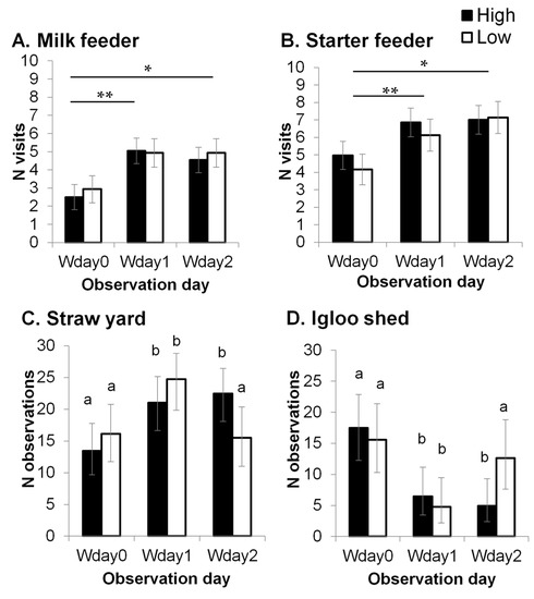 The number of milk feeder (A) and starter feeder (B) visits (predicted means ± SEM), and the number of times a calf was observed in the straw (C) and in the igloo shed (D) (back-transformed means and 95% Cis (confidence intervals).) before weaning started (Wday 0), in the middle of weaning (Wday 1) and when weaning was completed (Wday 3). *: significant difference between Wday 0 and Wday 2 (p < 0.01). **: significant difference between Wday 0 and Wday 1 (p < 0.001). a,b: different letters indicate significant differences (p < 0.05).