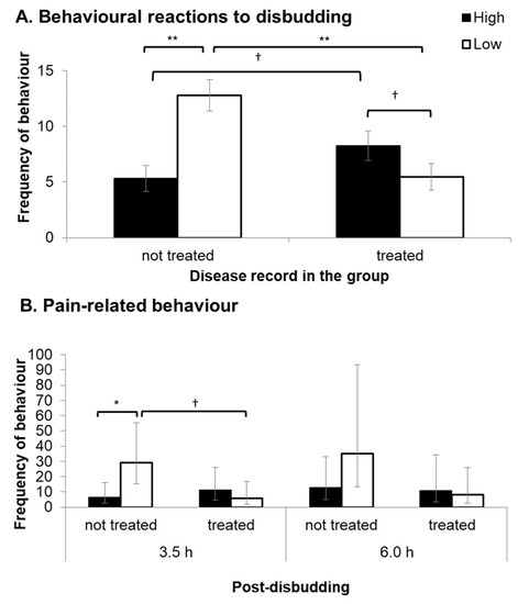 (A) Behavioural reactions (mean frequency ± SEM) to the disbudding procedure (head movement and kicking) for calves with no previous disease record in the group (not treated: n = 13 for High and 8 for Low) and calves with a previous disease record in the group (treated: n = 9 for High and 11 for Low). (B) Frequency of pain-related behaviours (back-transformed means and 95% Cis (confidence intervals).) displayed by calves with no previous disease record (not treated: n = 13 for High and 8 for Low) and calves with a previous disease record (treated) during live observations (10 min) 3.5 h and 6 h after disbudding. Each symbol indicates †: p < 0.1, *: p < 0.05, and **: p < 0.001.
