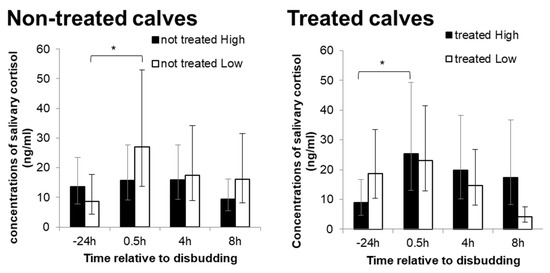Salivary samples were collected from all calves using cotton swabs 24 h before the procedure (baseline), and 30 min, 4 h and 8 h after the disbudding. Cotton swabs were centrifuged at 3000× g for 15 min and extracted saliva was stored at −20 °C until analysis. Concentrations of salivary cortisol were measured using a commercial kit (Cortisol ELISA (Saliva), ALPCO®, Salem, NH, USA) as per the smanufacturer’s recommendations.