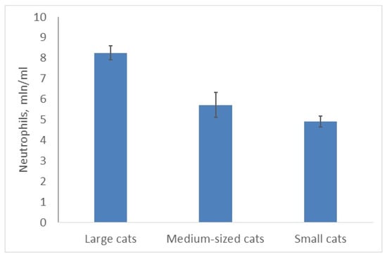 The situation is quite similar for the total number of neutrophils (as the main WBC type in cats) (Figure 2) and segmented neutrophils (as the main type of neutrophils). The size of animals affected both indexes significantly (C, χ2 = 10.5; p = 0.0052 (22 species) and C, χ2 = 8.747; p = 0.0013 (25 species) respectively). Both indexes with the same coefficient (r = 0.6; p < 0.05) correlated with the body masses of the species. Leopards (large cat) and clouded leopards (medium-sized cat) had the highest numbers of neutrophils (9.9 mln/mL); the bobcat and the black-footed cat (both—small cats)—the lowest (3.8–4.4). Unfortunately, there were no data available on different leukocyte types in the rusty-spotted cat.