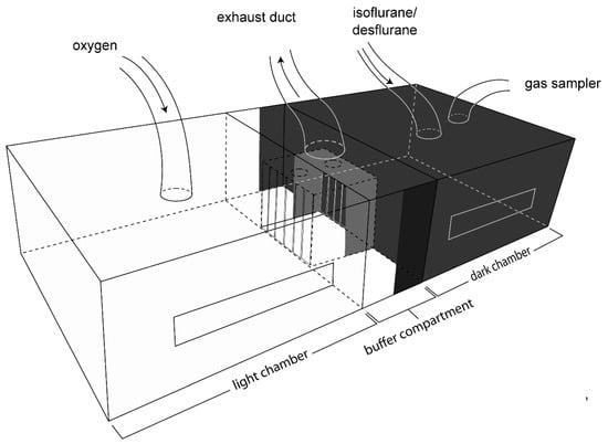 The Plexiglas light-dark aversion-avoidance box (Figure 1), provided by D. Weary [6], was comprised of two chambers of identical size (28 × 31 × 14 cm each), which were connected by a smaller middle buffer compartment (11 × 31 × 14 cm). Exhaust from the buffer compartment was actively scavenged. The chambers were wrapped with white (light chamber) or black (dark chamber) opaque plastic. Observation slits (3 × 17 cm) were cut into the opaque plastic on one side of each chamber. The buffer compartment had a doorway (10 cm × 9 cm) on each side leading into each chamber. To prevent diffusion of gas between the chambers, the doorways were covered with overlapping strips of flexible plastic. Those of the dark chamber were black opaque strips to minimize light contamination (light intensity in the dark chamber did not exceed 2.5 Lux). Maintenance of isolated environments (anesthetic gas vs. room air) between the dark and light chambers was confirmed with a gas analyzer (sample rate 50 mL/min, LifeWindow LW6000V, Digicare Biomedical Technology Inc., West Palm Beach, FL, USA).