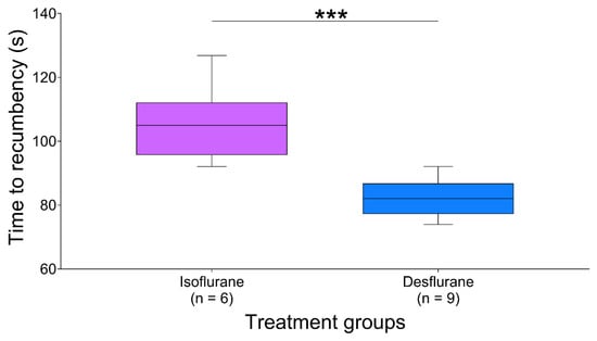 Time to recumbency. During initial exposure, 9/12 and 6/12 rats became recumbent after exposure to desflurane and isoflurane, respectively. Time to recumbency was shorter in rats exposed to desflurane than isoflurane. *** p < 0.001. Data are median (middle line in box), IQR (box limits) and 10–90 percentile (whiskers).