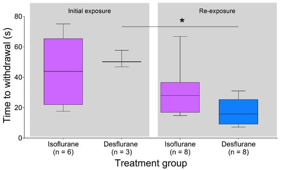 Time to withdrawal was similar for desflurane and isoflurane during both initial and re-exposure. Times to withdrawal between initial and re-exposure was not significant for isoflurane, but was significant for desflurane (p < 0.05). Data are presented as median (middle line in box), IQR (box limits) and 10–90 percentile (whiskers). * p < 0.05.