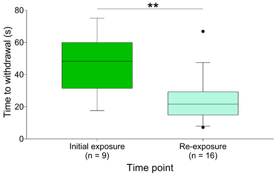 Time to withdrawal pooled by timepoint (initial and re-exposure). Rats withdrew faster upon re-exposure (p < 0.01). Sample sizes reflect animals that withdrew. ** p < 0.01. Data are presented as median (middle line in box), IQR (box limits) and 10–90 percentile (whiskers). Solid circles indicate outliers (values lying ± 1.5 × IQR).