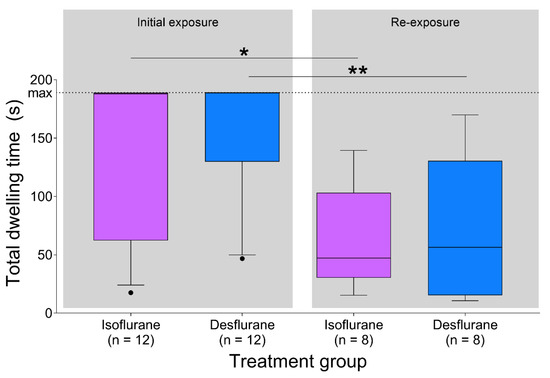 Total dwelling time in dark chamber (site of anesthetic gas exposure) was longer during initial exposure to both desflurane (p < 0.01) and isoflurane (p < 0.05). During initial exposure and re-exposure, dwelling time was similar between anesthetics (p > 0.05). Data are presented as median (middle line in box), IQR (box limits) and 10–90 percentile (whiskers). Horizontal dotted line indicates the maximum duration of testing (3 min). * p < 0.05, ** p < 0.01. Solid circles indicate outliers (values lying ± 1.5 × IQR).