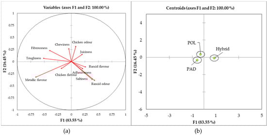 (a,b) Discriminant analysis performed on the sensory data of the consumers’ panel. Hybrid: Hybrid chicken. PAD: Padovana slow-growing breed. POL: Polverara slow-growing breed.