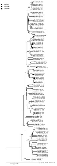 The high heterogeneity of PSV sequences on the same farm (farm C) may also be linked to the co-infection of different PSV strains in the same animal [14,16]. However, we cannot rule out that it occurred since no individual feces has been analyzed.