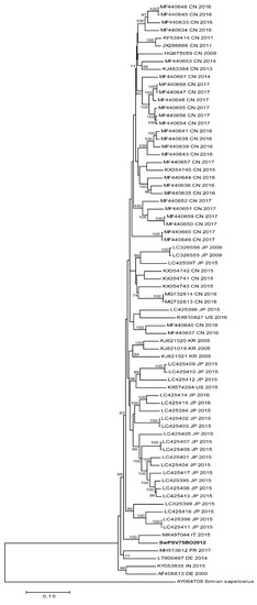 The 19 nucleotide sequences obtained were analyzed and edited using the Bionumerics software V.6.5 (Applied Maths, Kortrijk, Belgium) and deposited in GenBank under the accession number: SwPSV3B2018, MN836677; SwPSV14B2018, MN836678; SwPSV2B2018, MN836679; SwPSV1B2018, MN836680; SwPSV4B2018, MN836681; SwPSV13B2018, MN836682; SwPSV71BO2012, MN836665; SwPSV84BO2012, MN836666; SwPSV70BO2012, MN836667; SwPSV73BO2012, MN836668; SwPSV74BO2012, MN836669; SwPSV52BO2012, MN836670; SwPSV56BO2012, MN836671; SwPSV57BO2012, MN836672; SwPSV58BO2012, MN836673; SwPSVS45BO2012, MN836674; SwPSV55BO2012, MN836675; SwPSVS39BO2012, MN836676; SwPSV75BO2012, MN836683. Nucleotide sequence similarity searches were performed using the BLAST server on the NCBI GenBank database [22]. Three maximum likelihood (ML) trees were drawn with the MEGA7 software (www.megasoftwares.com) using the general time-reversible model with a Gamma distribution and invariant sites (GTR+G+I) as suggested by the MEGA7 model test, and 1000 bootstrap replicates. The trees were built using the partial VP1 sequences (790 nt), full genomes reported on NCBI database including the sole PSV complete genome obtained in this study and the 3CD region (3Cpro, the cysteine protease and 3Dpol the catalytic core of the viral replicase, the RNA-dependent RNA polymerase) [23] obtained from the full genome.