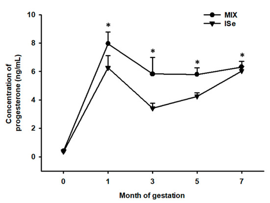 To determine the effect of supplementation with MIX versus ISe on the concentration of systemic P4 during gestation, estrous was synchronized in cows using an intravaginal Controlled Internal Drug Releasing (CIDR) device (ZOETIS EAZI-BREED™ CIDR ® 1.38 g progesterone, Zoetis, Parsippany, NJ, USA) for 7 days, with each cow administered 25 mg of PGF2α at CIDR removal. At observed estrus, cows were artificially inseminated by an experienced technician. Pregnancy was confirmed via transrectal ultrasonography at 45 days after insemination, and only cows that conceived to artificial insemination (AI) were included in this study (ISe, n = 12; MIX, n = 14). At months 0, 1, 3, 5, and 7 of gestation, 8 mL of blood was collected via jugular venipuncture into sodium-heparin-containing tubes for retrieval and quantification of plasma concentrations of P4 by radioimmunoassay (RIA) [31].
