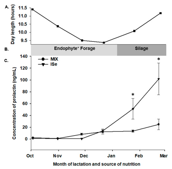 Effect of the form of Se on the systemic concentration of prolactin (PRL) during lactation. (A) Day length (hours), (B) basal diet (endophyte-infected tall fescue pasture versus silage), and (C) serum concentrations of PRL during lactation. Cows had ad libitum access to vitamin-mineral premixes containing 35 ppm of either inorganic (ISe; sodium selenite; n = 12), or a 1:1 combination (MIX) of ISe and OSe (SEL-PLEX; n = 12) selenium. The concentration of PRL was affected by time (p < 0.001) and treatment by time (p < 0.001) but not by treatment (p = 0.8). * The concentration of PRL was elevated in ISe-supplemented cows in the 5th and 6th periods (February and March).