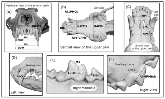 The data presented here were obtained on three different days by two independent observers. For the LCW, LCc, LbC, L1PMc, and L1Mc, 15 non-articulated mandibles were positioned and attached to the cranium in order to make accurate measurements. The damaged or worn mandibular incisor teeth were not considered in this study for the morphometric analysis. Likewise, the maxillary series of molar teeth, and the second and third mandibular molar teeth were also not considered for the morphometric analysis. The UbC, LbC (not shown), and Ubi, and the canine width and length measurements (UrCWd, UrCLe, UlCWd, UlCLe (Figure 1A–D) and, LrCWd, LrCLe, LlCWd, LlCLe, Ur4PMtub, Ul4PMtub, Lr1Mtub, and Ll1Mtub), were taken from the furcation (the point at which the roots diverge) at the level of the cementoenamel junction (the boundary between dental enamel and cement: Figure 1D–F).